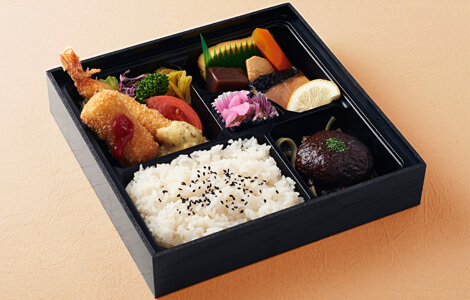 合挽ハンバーグ、煮物、サラダ、ライス - セミナーなどでのご利用に人気のお弁当です。